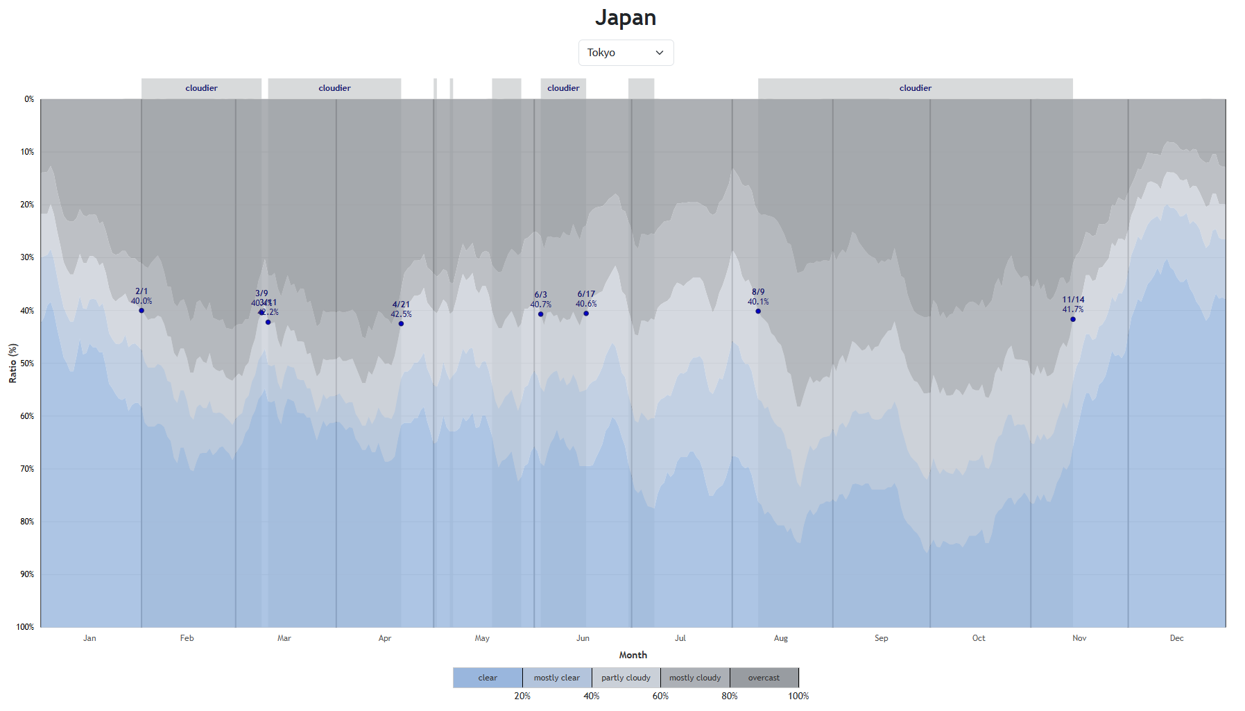 快晴・ほぼ快晴・所により曇り・曇りといった区分を視覚的に表示し、年間を通じた空模様の変化を直感的に把握することができます。