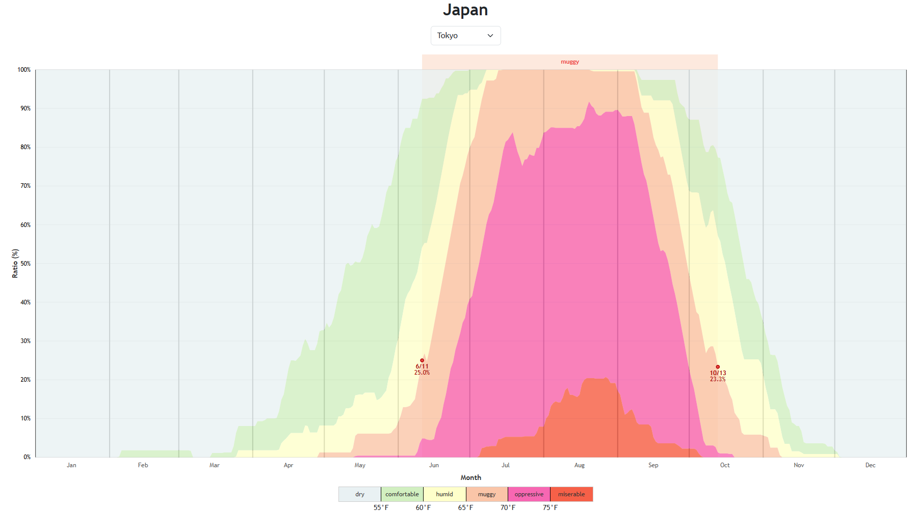 快適とされる湿度帯を基準に、乾燥・快適・蒸し暑いなどの状態を色分けして表示し、年間を通じた湿度の変化を直感的に把握することができます。