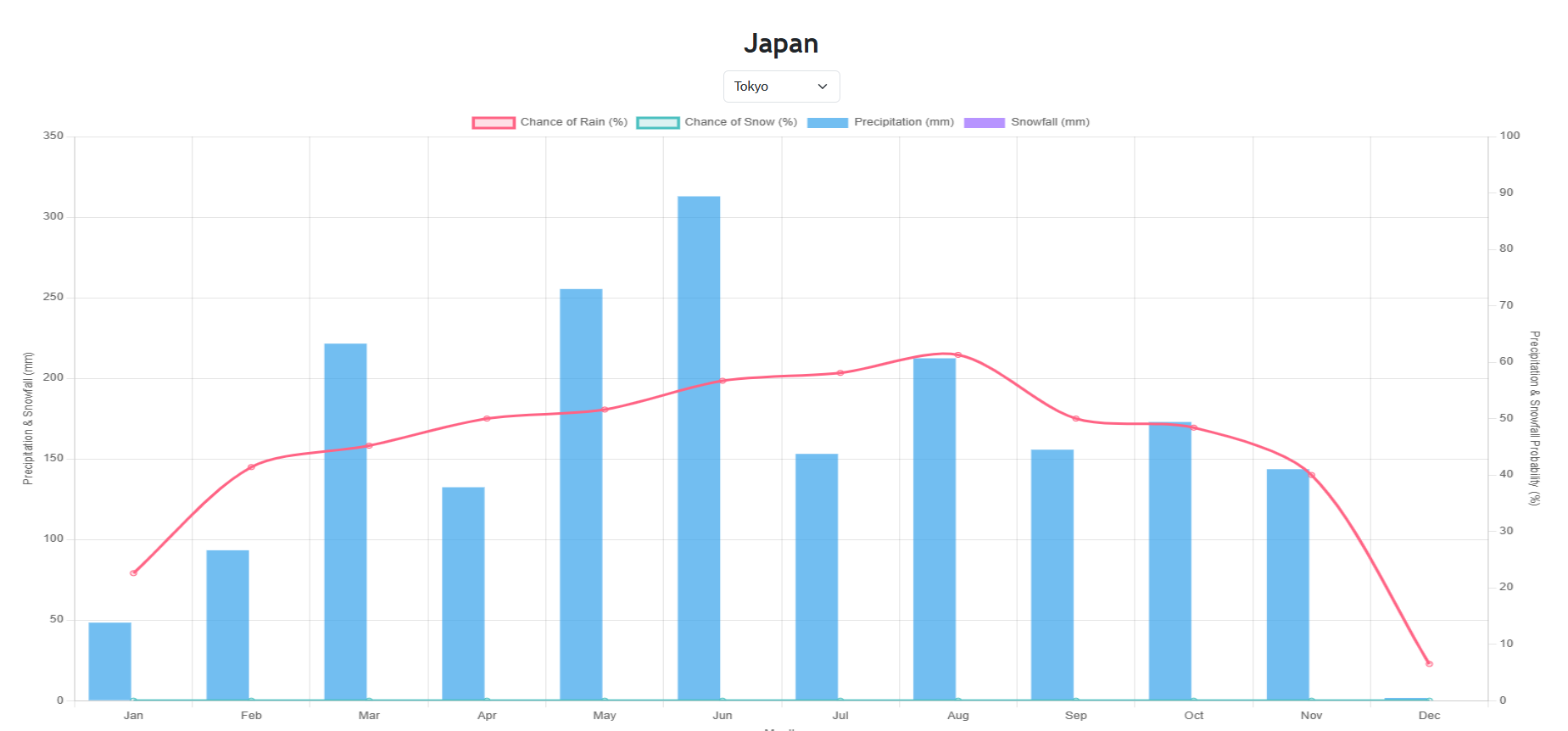 降水量、降水日数、降水確率などを棒グラフや折れ線グラフでわかりやすく表示し、年間を通じた雨の傾向を直感的に把握することができます。
