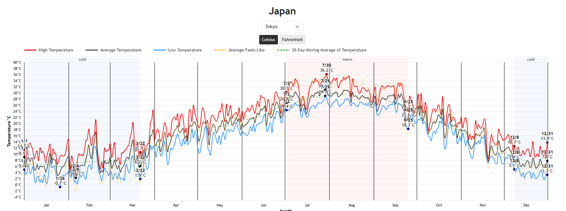 最高気温・最低気温・平均気温・体感温度の推移をグラフで表示し、季節ごとの気候変化を直感的に把握することができます。