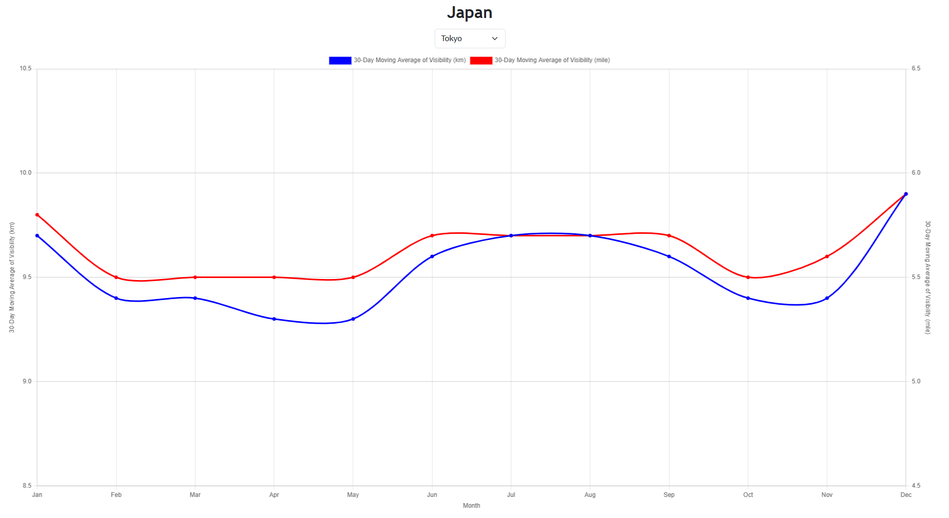 大気の透明度を示す視程を、キロメートルとマイルの両単位で表示し、30日移動平均線によって季節や天候による変化を直感的に把握することができます。