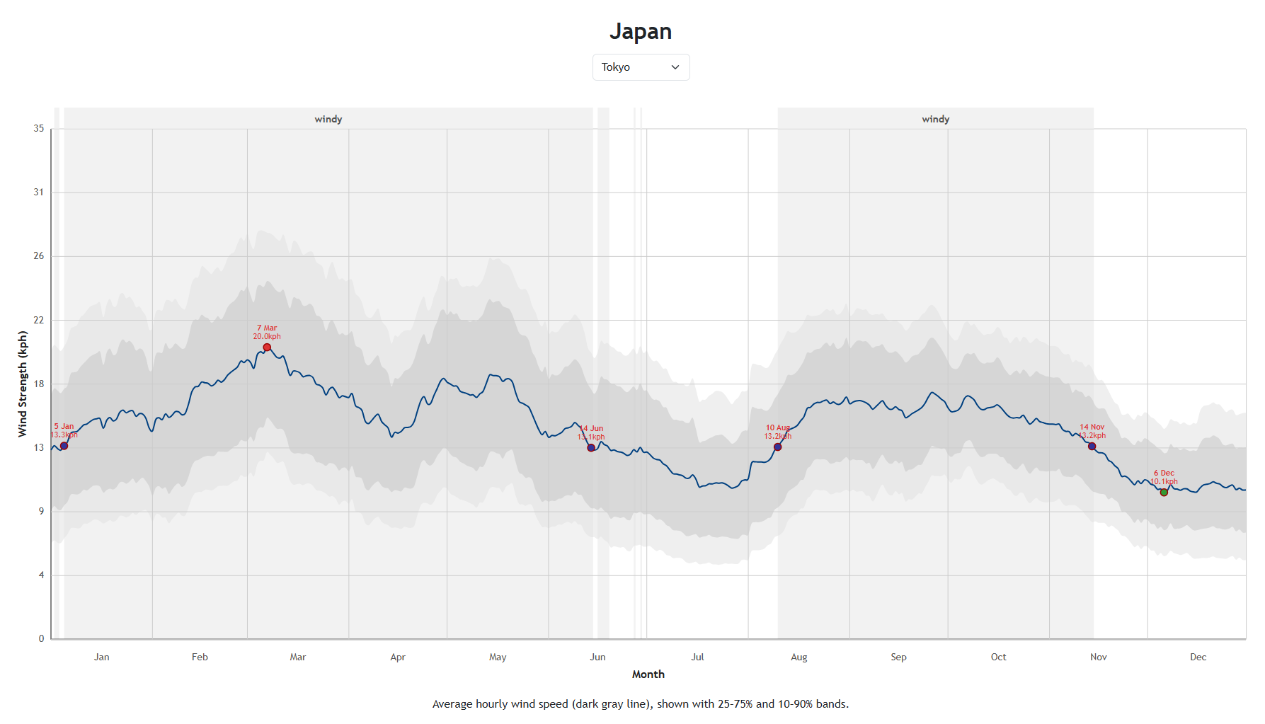 主要都市の風向の年間推移を一目で確認できる、多機能な風向ウィジェットです。